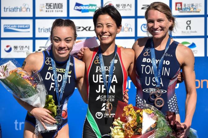 Ueda, celebrated her 35th birthday yesterday, stormed across the finish line to win the race and was finally presented with the gold medal here at the ITU Tongyeong World Cup.