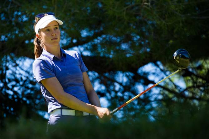 Italian Avanzo, (above, tapped in for an eagle on her last hole, the par-4 seventh, to get into a share of the lead for the first time in six years as a professional and she said: “I hit a lot of fairways and a lot of greens, which is very important on this course, because when you go in the rough it’s basically impossible to go for the green. I hit 16 greens today, putted very well and obviously on the last hole, I eagled it. I put my 3-wood very close and it was just a short tap-in. I’ve been playing pretty well but just not scoring the way I wanted so today gives me more trust in my game.”