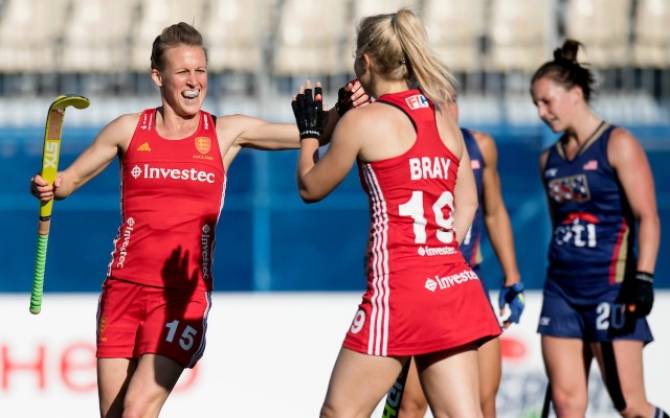 Two goals from Sophie Bray ensured England progressed to the semi-finals of the Sentinel Homes Hockey World League final with a hard fought win over the USA.