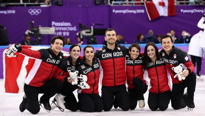 After the women's free skating, Canada had already secured first place, with ice dancers Tessa Virtue and Scott Moir still left to compete. With the pressure taken off them, the pair were outstanding, finishing first with 118.10 points, six points ahead of US skaters Maia and Alex Shibutani, who helped the USA win bronze.