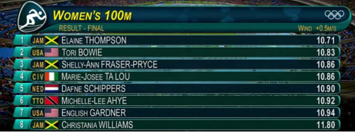 In the women's 100m, all eyes were on Shelly-Ann Fraser-Pryce, who was seeking to become the first woman in track to win three Olympic gold medals in a row. But it was her fellow Jamaican Elaine Thompson who ran away with gold.