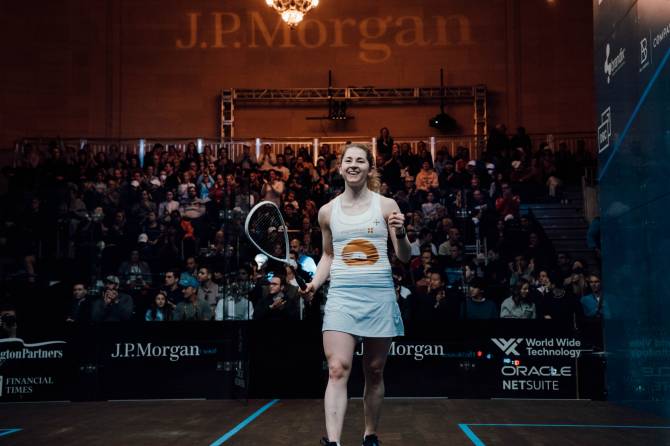 England’s Georgina Kennedy, playing in her first major tournament since September, got the better of World No.7 Rowan Elaraby to make it through to the quarter finals of the J.P. Morgan Tournament of Champions at the incredible Grand Central Terminal.